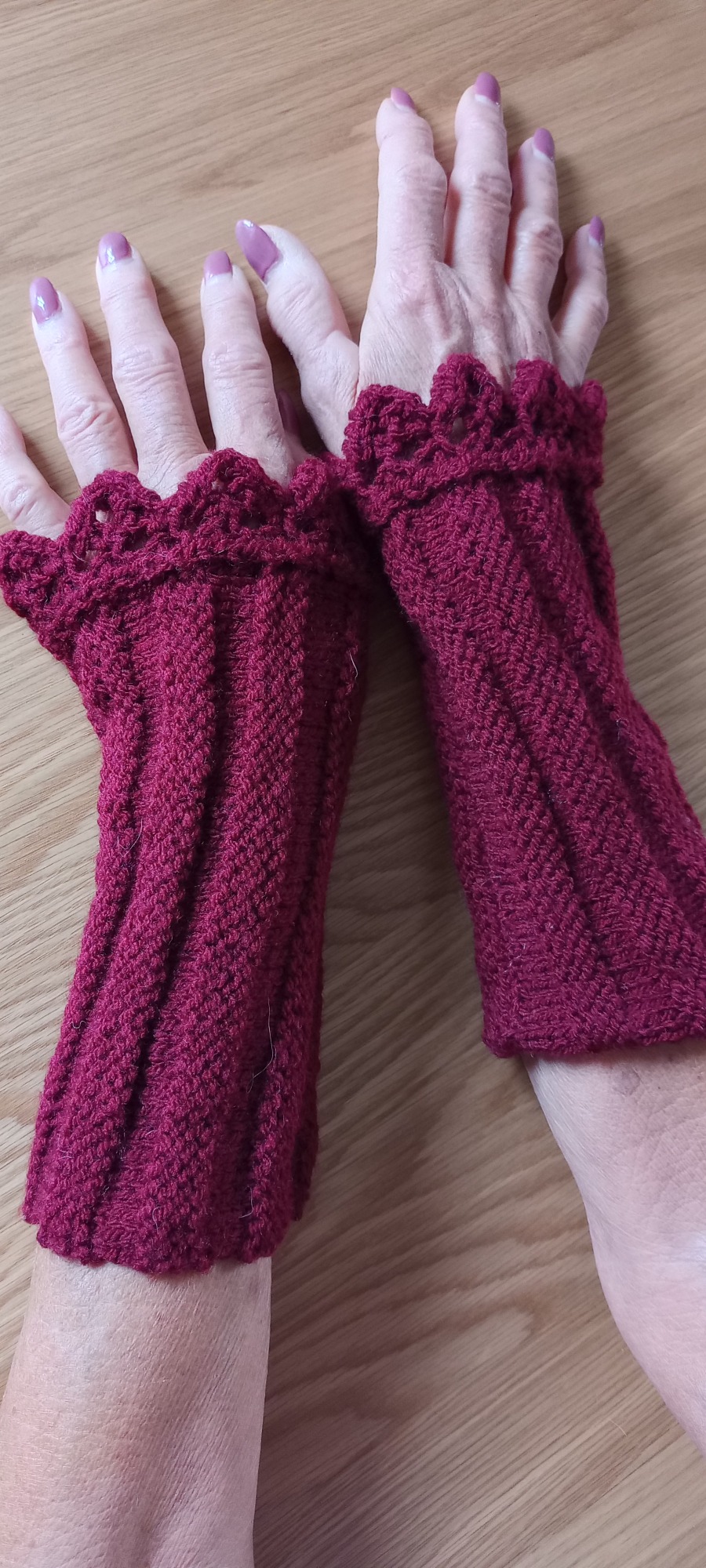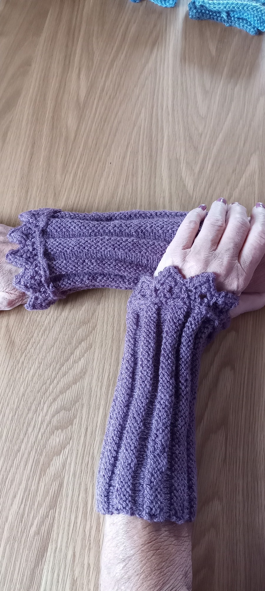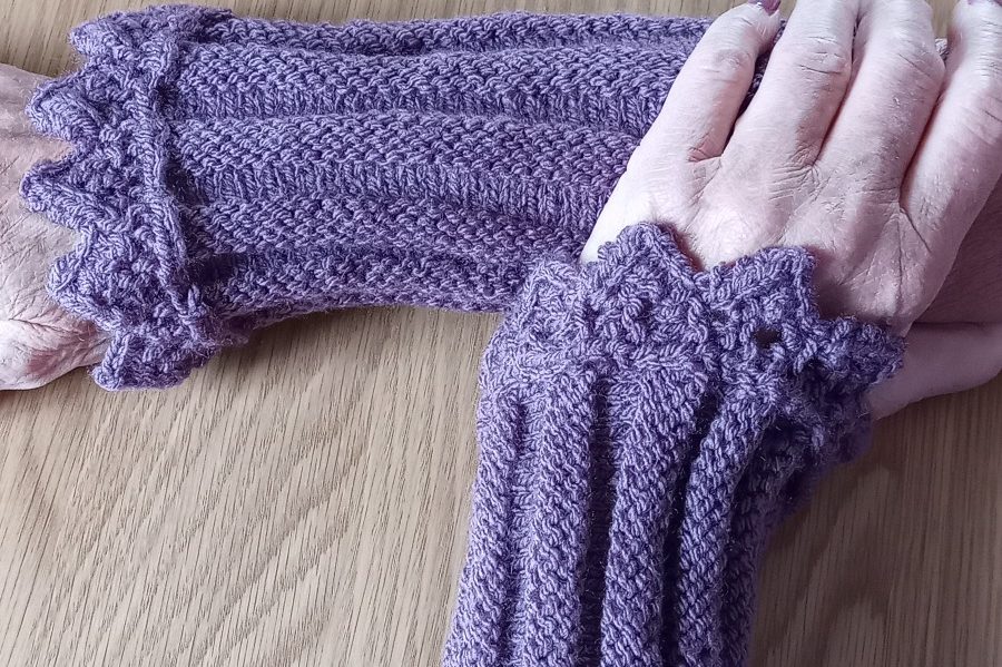 Dessa handledsvärmare är stickade i mjukt akrylgarn i vacker lila ton. Fin spetskant upptill.