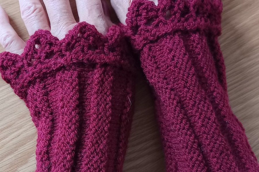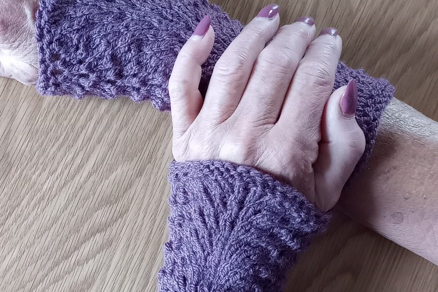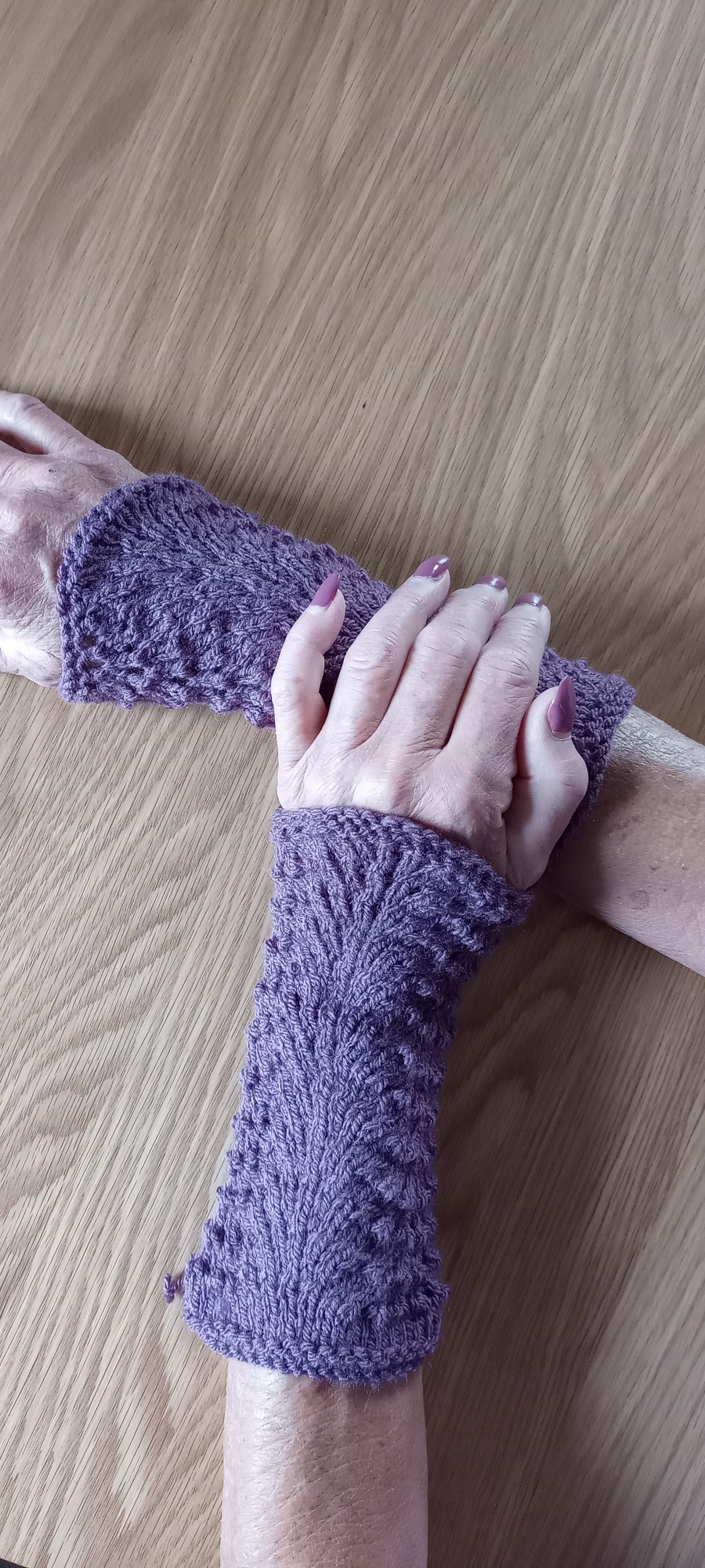 Dessa handledsvärmare är stickade i mjukt akrylgarn i vacker lila ton. Mönstret kallas påfågelmönster.