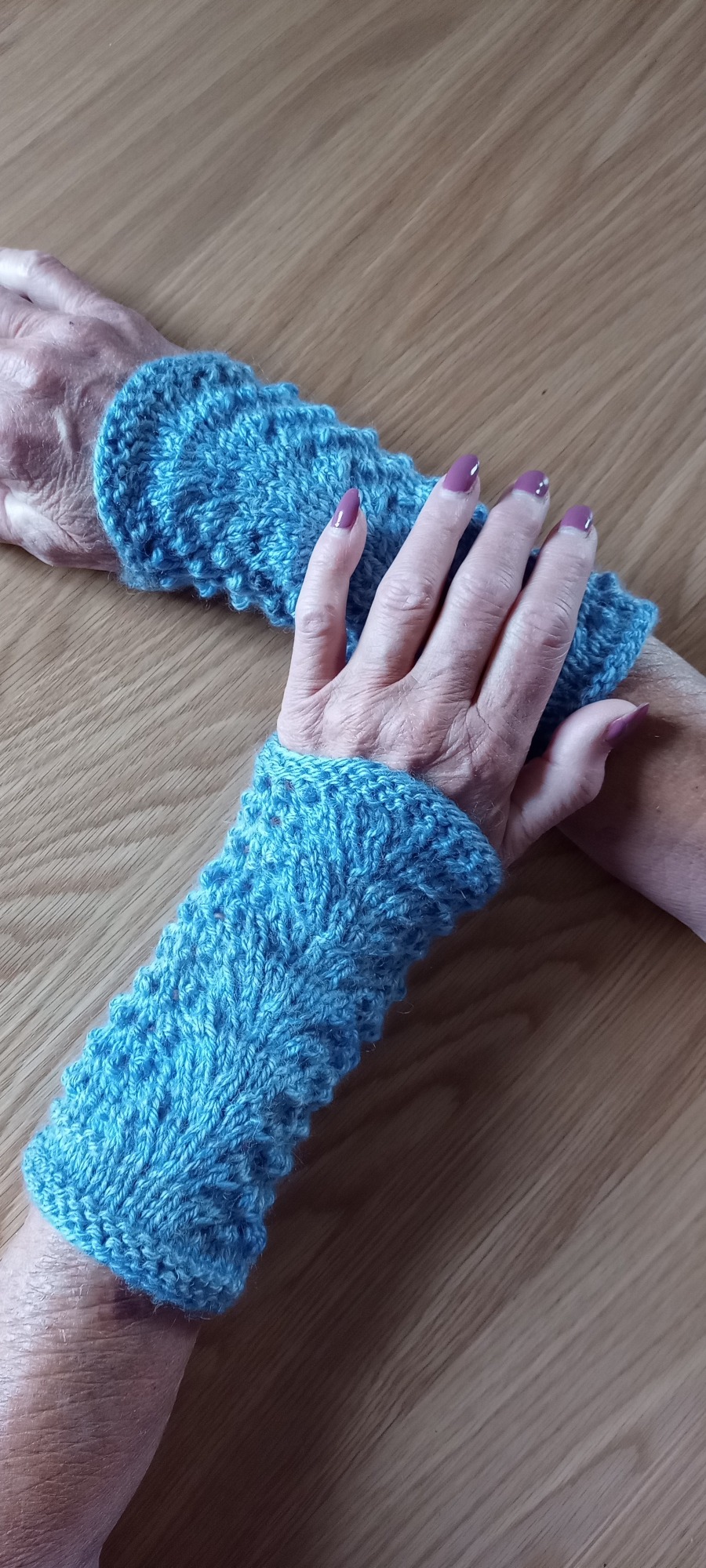 Dessa handledsvärmare är stickade i mjukt akrylgarn i jeansblå färg. Mönstret kallas påfågelmönster.