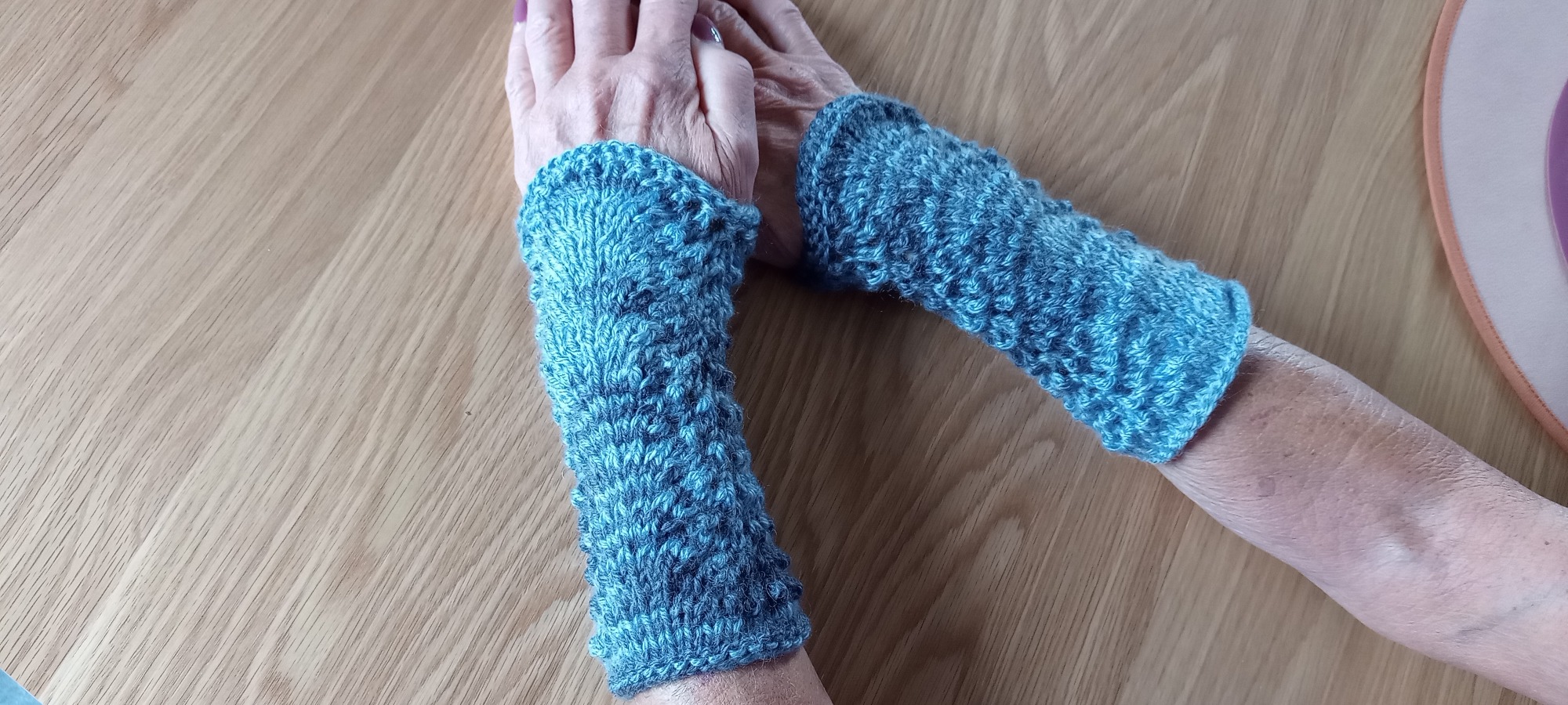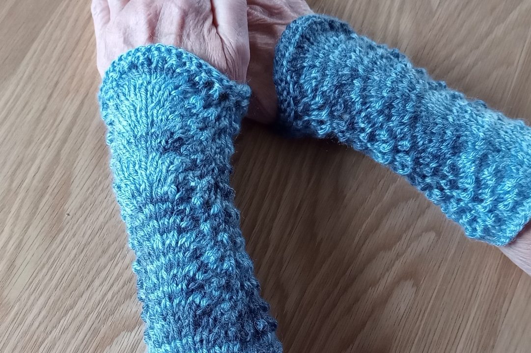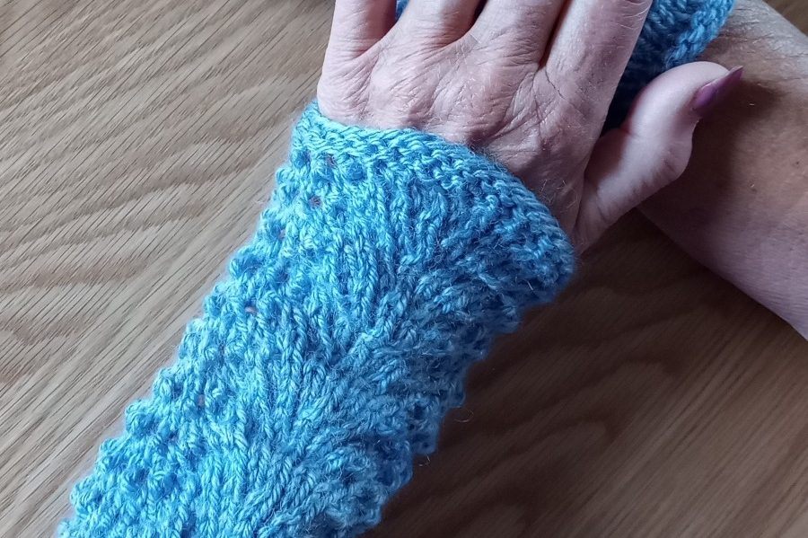 Dessa handledsvärmare är stickade i blåmelerat mjukt akrylgarn. Mönstret kallas påfågelmönster.